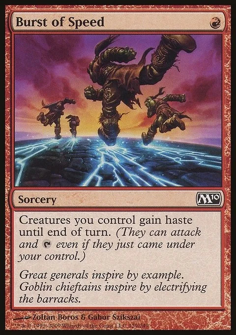 Creatures you control gain haste until end of turn. (They can attack and {T} even if they just came under your control.)