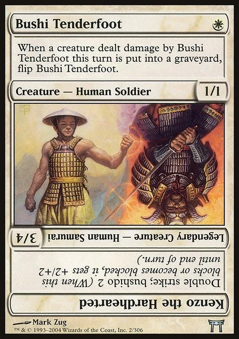 Bushi Tenderfoot When a creature dealt damage by Bushi Tenderfoot this turn dies, flip Bushi Tenderfoot. Kenzo the Hardhearted Double strike; bushido 2 (Whenever this creature blocks or becomes blocked, it gets +2/+2 until end of turn.)