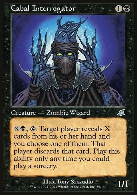 XB, T: Target player reveals X cards from his or her hand and you choose one of them. That player discards that card. Play this ability only when you could play a sorcery.