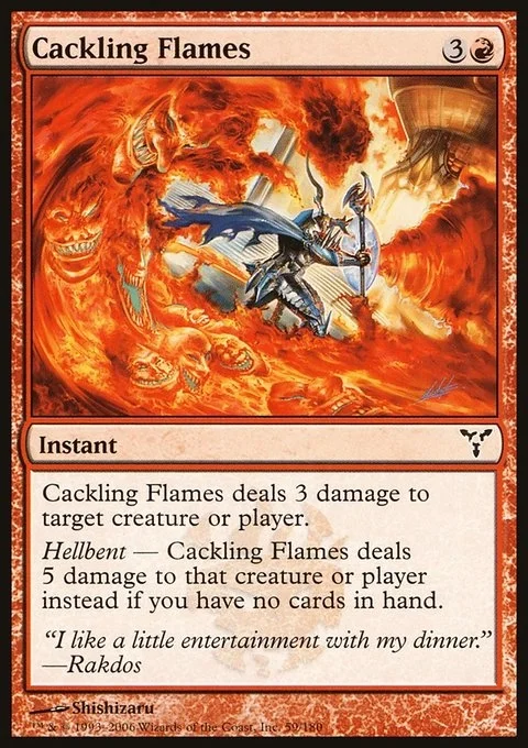 Cackling Flames deals 3 damage to any target. Hellbent — Cackling Flames deals 5 damage instead if you have no cards in hand.
