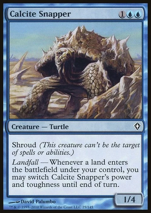 Shroud (This creature can't be the target of spells or abilities.) Landfall — Whenever a land enters the battlefield under your control, you may switch Calcite Snapper's power and toughness until end of turn.