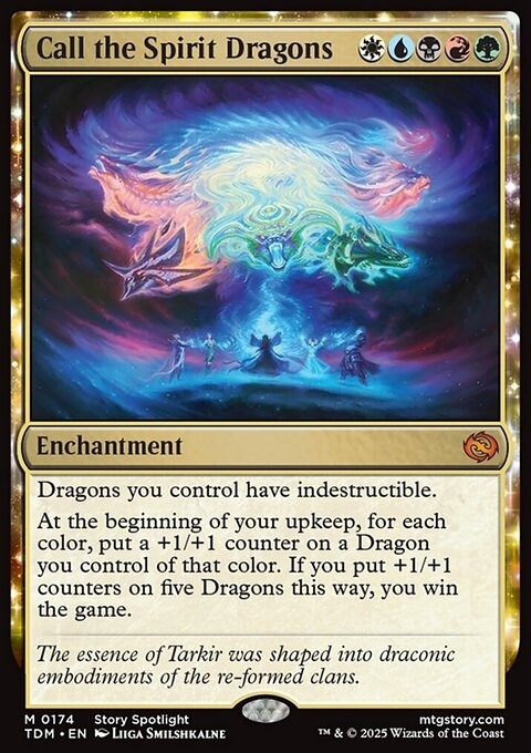 Dragons you control have indestructible. At the beginning of your upkeep, for each color, put a +1/+1 counter on a Dragon you control of that color. If you put +1/+1 counters on five Dragons this way, you win the game.