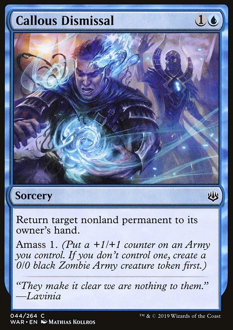 Return target nonland permanent to its owner's hand. Amass Zombies 1. (Put a +1/+1 counter on an Army you control. It's also a Zombie. If you don't control an Army, create a 0/0 black Zombie Army creature token first.)