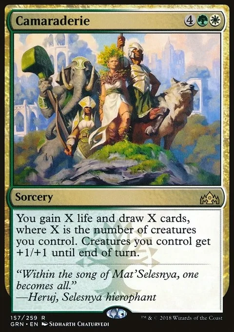 You gain X life and draw X cards, where X is the number of creatures you control. Creatures you control get +1/+1 until end of turn.
