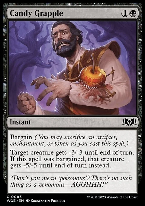 Bargain (You may sacrifice an artifact, enchantment, or token as you cast this spell.) Target creature gets -3/-3 until end of turn. If this spell was bargained, that creature gets -5/-5 until end of turn instead.