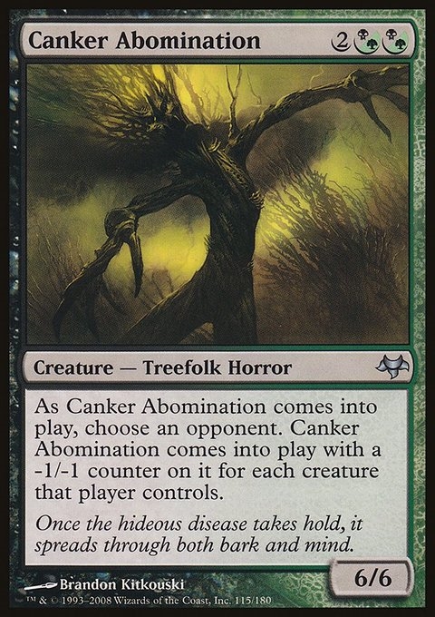 As Canker Abomination enters the battlefield, choose an opponent. Canker Abomination enters the battlefield with a -1/-1 counter on it for each creature that player controls.