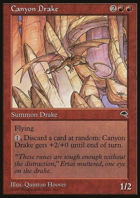 Flying1, Discard a card at random: Canyon Drake gets +2/+0 until end of turn.