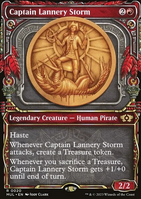 Haste Whenever Captain Lannery Storm attacks, create a Treasure token. (It's an artifact with "{T}, Sacrifice this token: Add one mana of any color.") Whenever you sacrifice a Treasure, Captain Lannery Storm gets +1/+0 until end of turn.