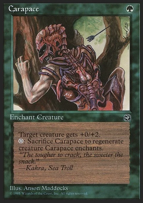 Enchant creature Enchanted creature gets +0/+2. Sacrifice Carapace: Regenerate enchanted creature.