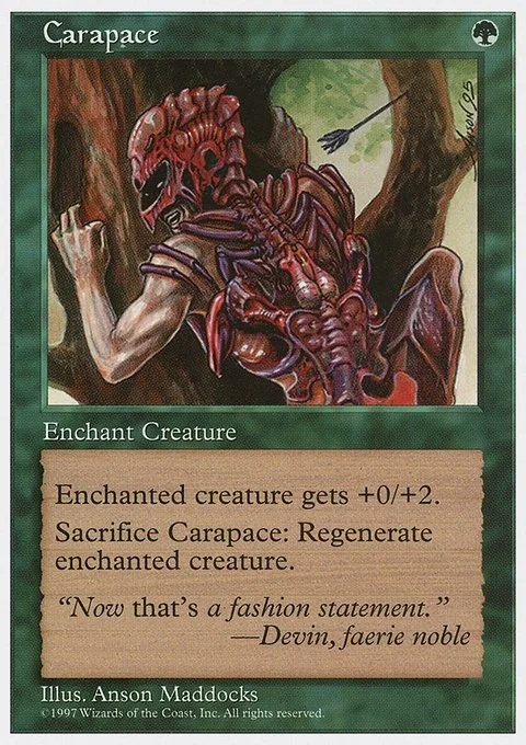 Enchant creature Enchanted creature gets +0/+2. Sacrifice Carapace: Regenerate enchanted creature.