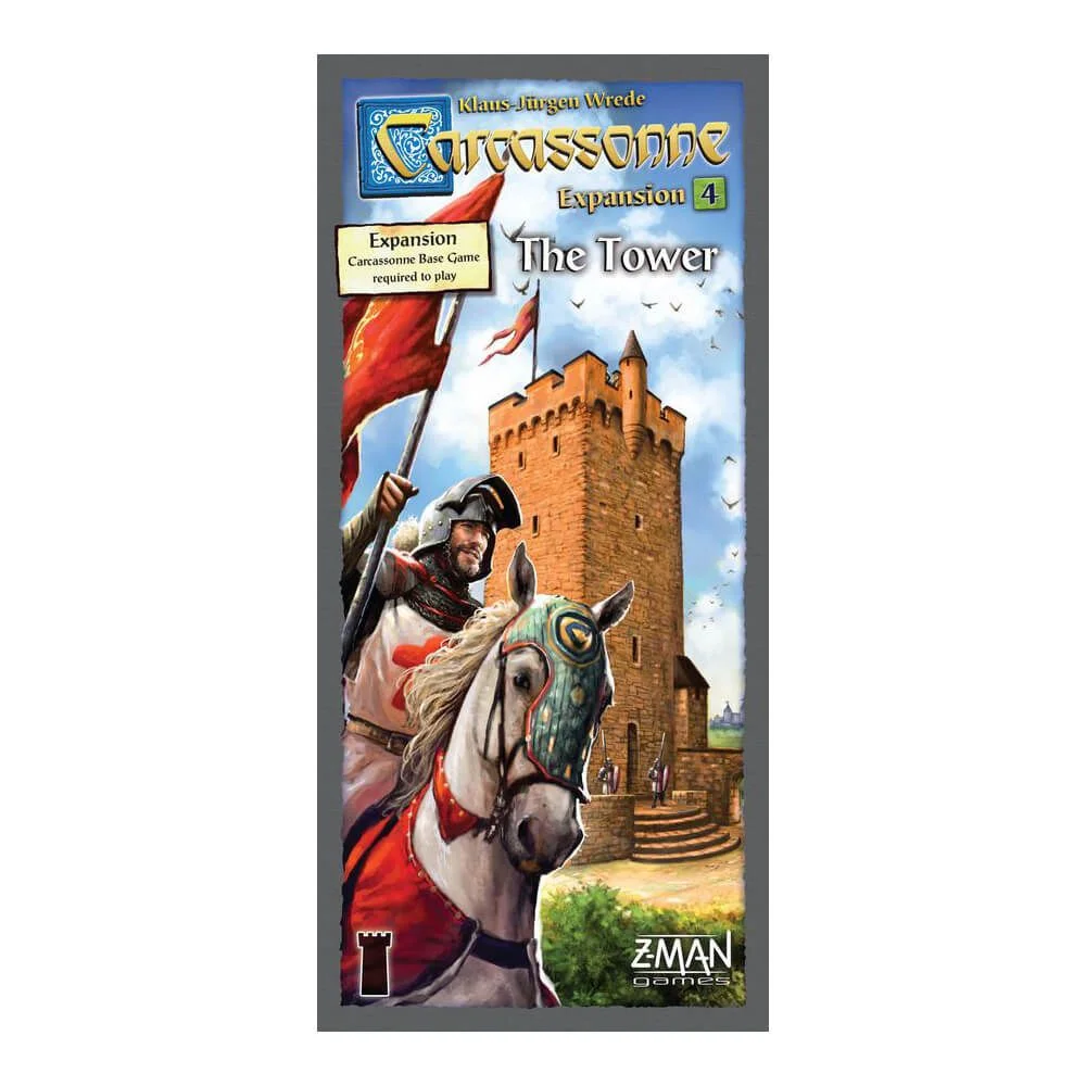 The Tower is the fourth major expansion for the Carcassonne game. Tower segments are added to the game, as well as some new actions. Instead of placing a Meeple as usual on their turns, players can now either place a tower segment on a tile with a space for a tower, add a tower segment to a tower already standing, or place a Meeple on top of a tower (which "finishes" it).