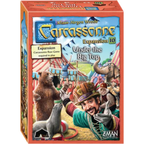 The tent has been pitched outside of town and the performers are ready to thrill the crowd with their death-defying stunts. A new world of excitement awaits in Under the Big Top, the tenth expansion for award-winning tile-laying game Carcassonne. Capturing the thrill of the circus, this expansion incorporates twenty new Land tiles and two new follower types into the Carcassonne library. Players can use them to attract people from all over the countryside to view their menagerie of animals or witness their feats of death-defying skill. Just like the daring risks that circus performers take, Under the Big Top gives players plenty of opportunities to score big points—if they can draw in the crowds!