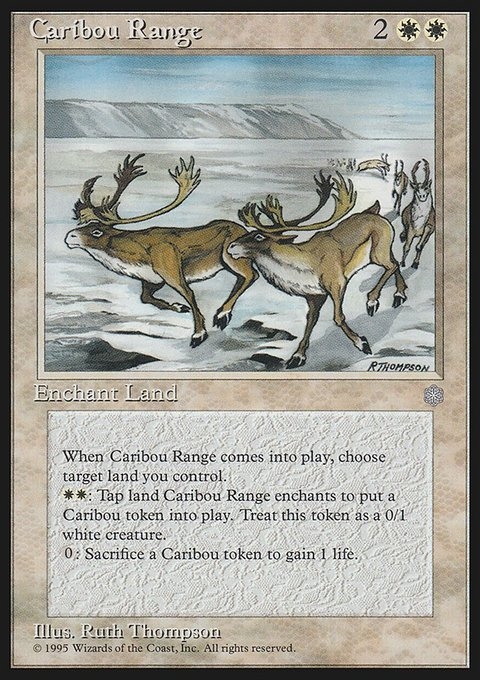 When Caribou Range comes into play, choose target land you control.WW: Tap land Caribou Range enchants to put a Caribou token into play. Treat this token as a 0/1 white creature.0: Sacrifice a Caribou token to gain 1 life.