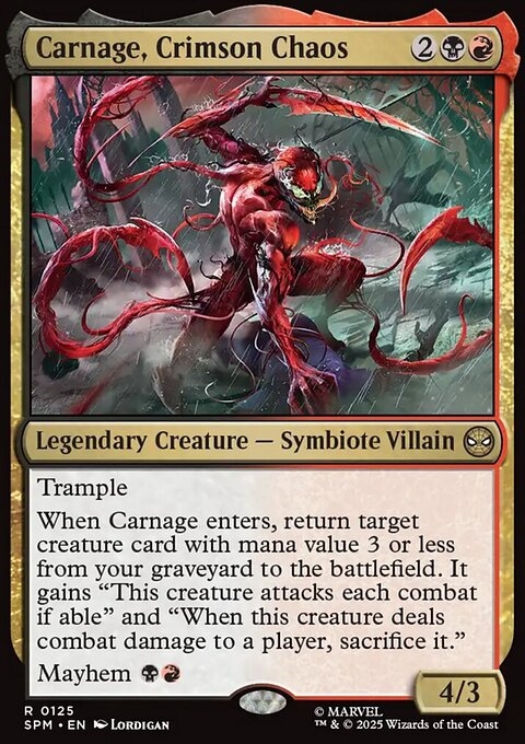 When Carnage enters, return target creature card with mana value 3 or less from your graveyard to the battlefield. It gains "This creature attacks each combat if able" and "When this creature deals combat damage to a player, sacrifice it."