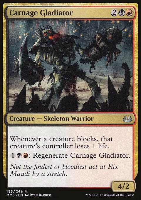 Whenever a creature blocks, that creature's controller loses 1 life. {1}{B}{R}: Regenerate Carnage Gladiator.