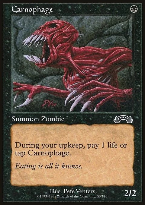 At the beginning of your upkeep, tap Carnophage unless you pay 1 life.