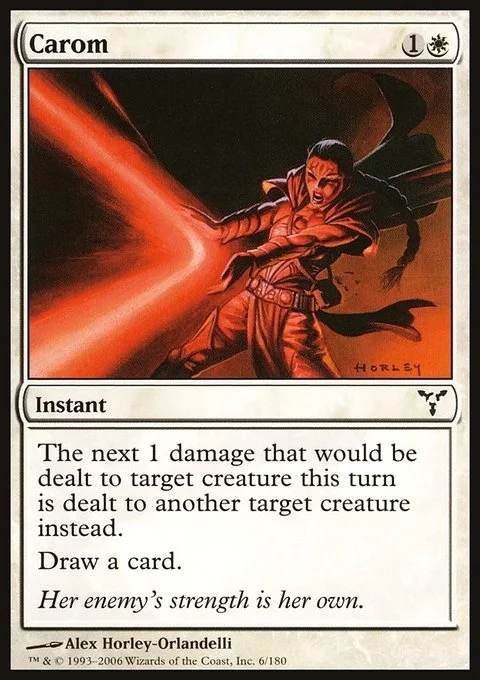 The next 1 damage that would be dealt to target creature this turn is dealt to another target creature instead. Draw a card.