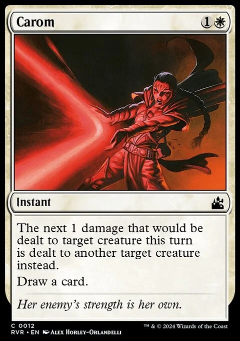 The next 1 damage that would be dealt to target creature this turn is dealt to another target creature instead. Draw a card.