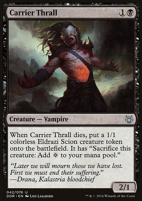 When Carrier Thrall dies, create a 1/1 colorless Eldrazi Scion creature token. It has "Sacrifice this creature: Add {C}."