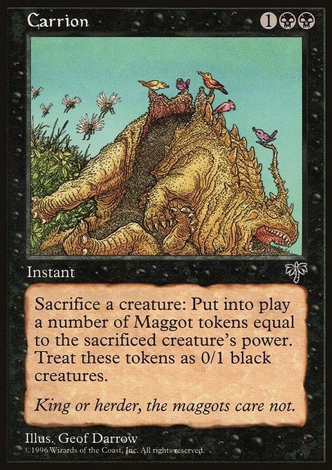 Sacrifice a creature: Put into play a number of Maggot tokens equal to the sacrificed creature’s power. Treat these tokens as 0/1 black creatures.