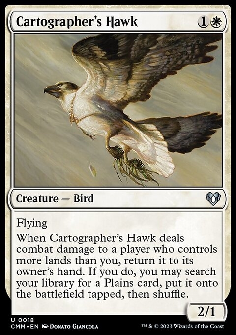 Flying When Cartographer's Hawk deals combat damage to a player who controls more lands than you, return it to its owner's hand. If you do, you may search your library for a Plains card, put it onto the battlefield tapped, then shuffle.