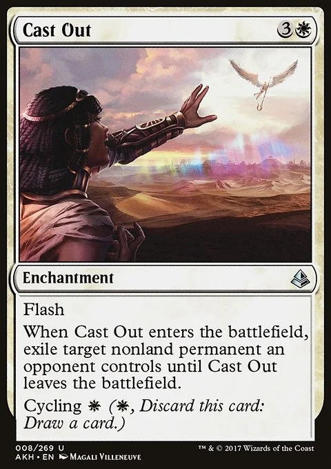 Flash When Cast Out enters, exile target nonland permanent an opponent controls until Cast Out leaves the battlefield. Cycling {W} ({W}, Discard this card: Draw a card.)