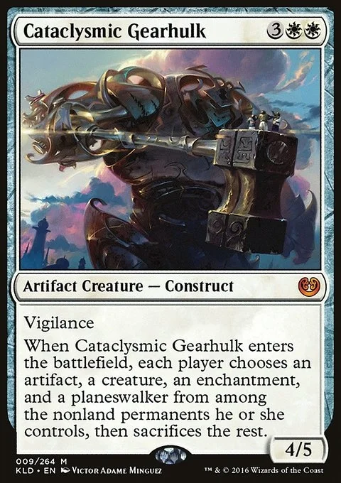 Vigilance When Cataclysmic Gearhulk enters the battlefield, each player chooses an artifact, a creature, an enchantment, and a planeswalker from among the nonland permanents they control, then sacrifices the rest.
