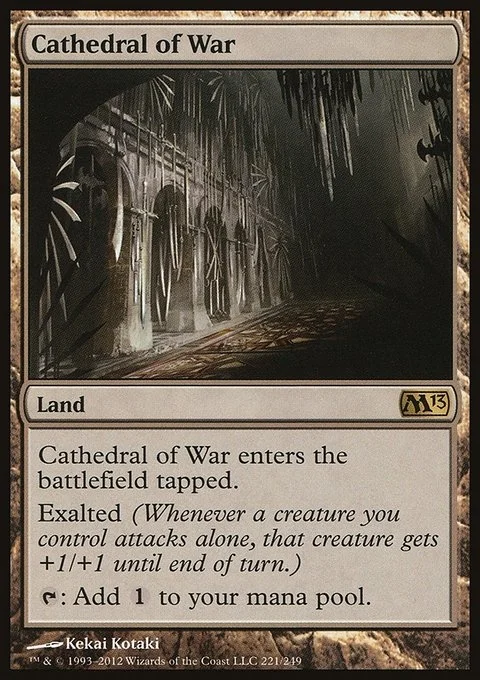 Cathedral of War enters the battlefield tapped. Exalted (Whenever a creature you control attacks alone, that creature gets +1/+1 until end of turn.) {T}: Add {C}.