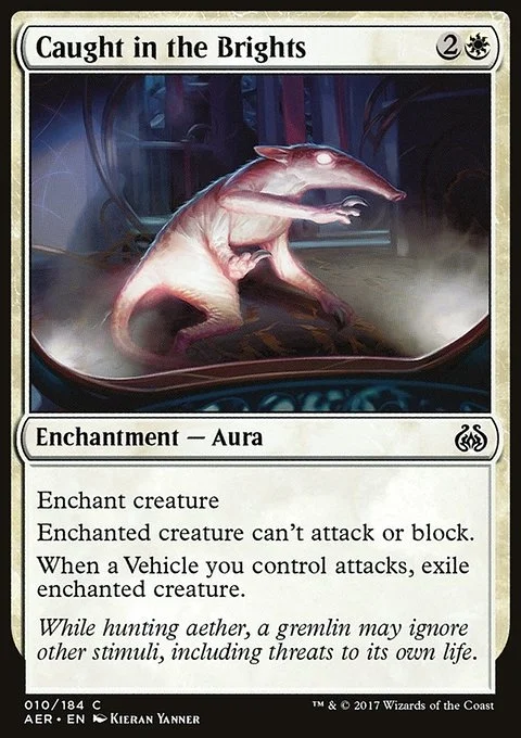 Enchant creature Enchanted creature can't attack or block. When a Vehicle you control attacks, exile enchanted creature.