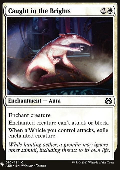 Enchant creature Enchanted creature can't attack or block. When a Vehicle you control attacks, exile enchanted creature.