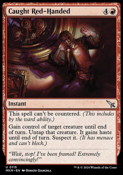 This spell can't be countered. (This includes by the ward ability.) Gain control of target creature until end of turn. Untap that creature. It gains haste until end of turn. Suspect it. (It has menace and can't block.)