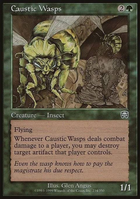 Flying Whenever Caustic Wasps deals combat damage to a player, you may destroy target artifact that player controls.