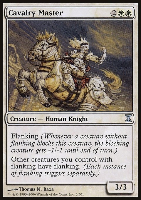 Flanking (Whenever a creature without flanking blocks this creature, the blocking creature gets -1/-1 until end of turn.) Other creatures you control with flanking have flanking. (Each instance of flanking triggers separately.)