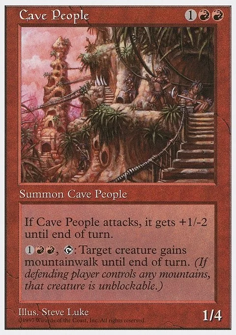 If Cave People attacks, it gets +1/-2 until end of turn.1RR, T: Target creature gains mountainwalk until end of turn. (If defending player controls any mountains, that creature is unblockable.)