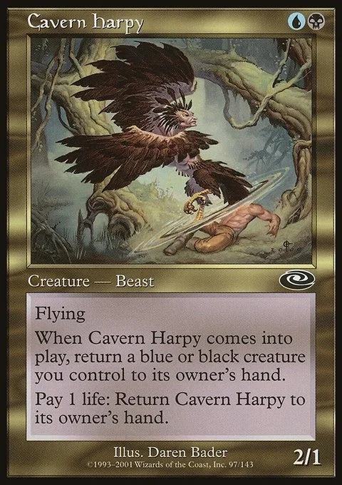 Flying When Cavern Harpy enters the battlefield, return a blue or black creature you control to its owner's hand. Pay 1 life: Return Cavern Harpy to its owner's hand.