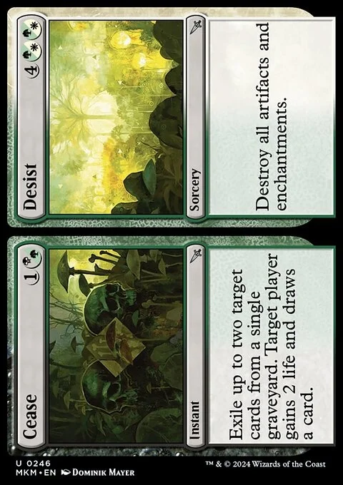 Cease Exile up to two target cards from a single graveyard. Target player gains 2 life and draws a card. Desist Destroy all artifacts and enchantments.