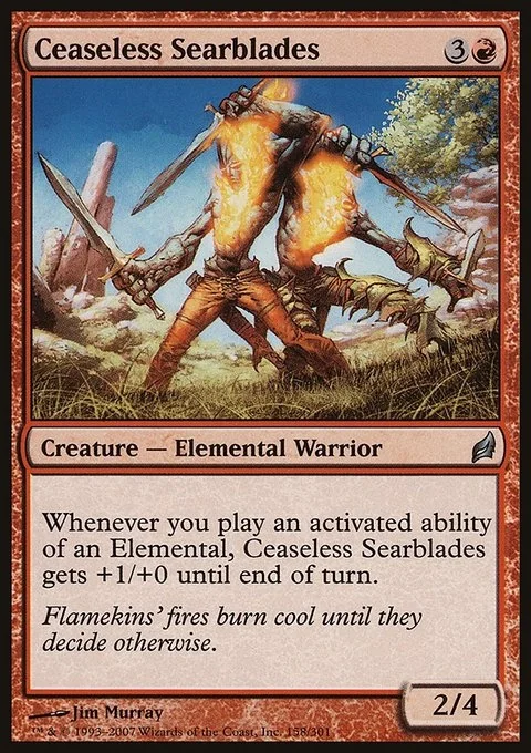 Whenever you activate an ability of an Elemental, Ceaseless Searblades gets +1/+0 until end of turn.