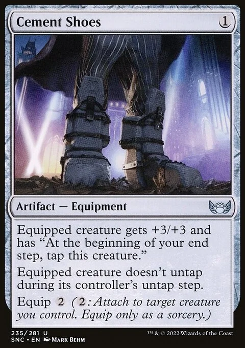 Equipped creature gets +3/+3 and has "At the beginning of your end step, tap this creature." Equipped creature doesn't untap during its controller's untap step. Equip {2} ({2}: Attach to target creature you control. Equip only as a sorcery.)