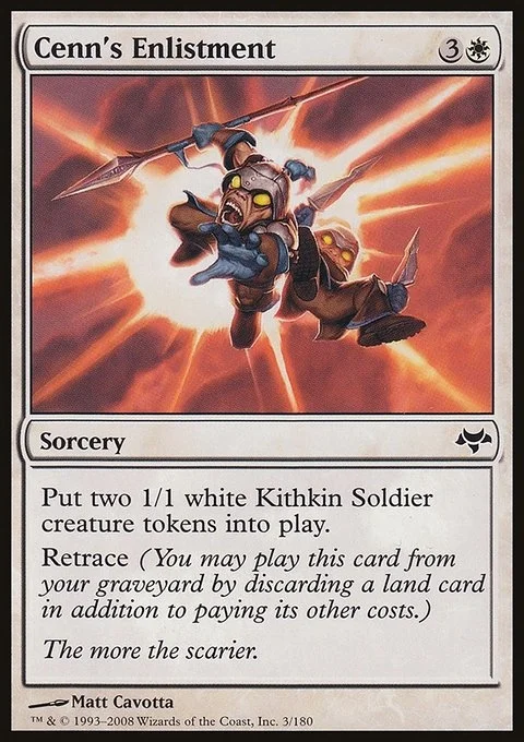 Create two 1/1 white Kithkin Soldier creature tokens. Retrace (You may cast this card from your graveyard by discarding a land card in addition to paying its other costs.)