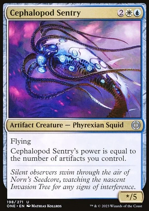 Flying Cephalopod Sentry's power is equal to the number of artifacts you control.