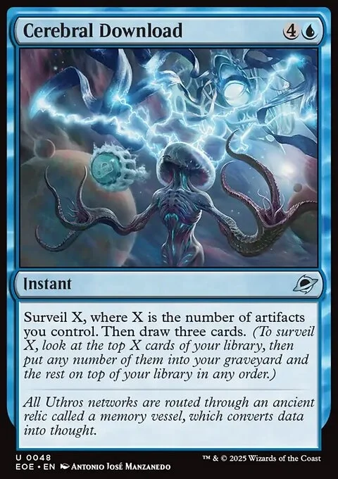 Surveil X, where X is the number of artifacts you control. Then draw three cards. (To surveil X, look at the top X cards of your library, then put any number of them into your graveyard and the rest on top of your library in any order.)