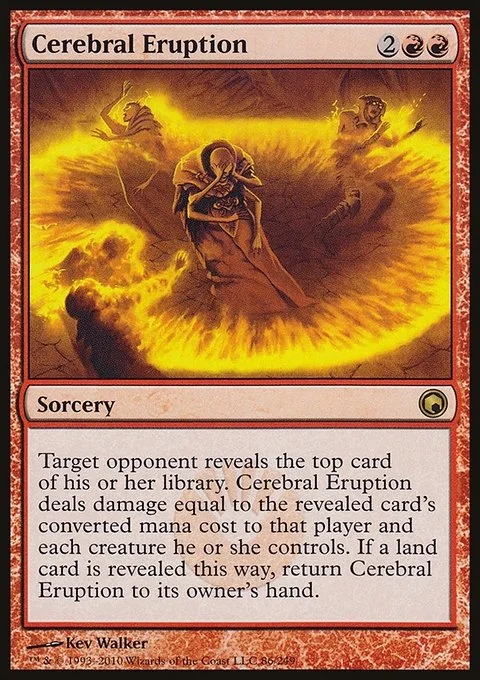 Target opponent reveals the top card of their library. Cerebral Eruption deals damage equal to the revealed card's converted mana cost to that player and each creature that player controls. If a land card is revealed this way, return Cerebral Eruption to its owner's hand.