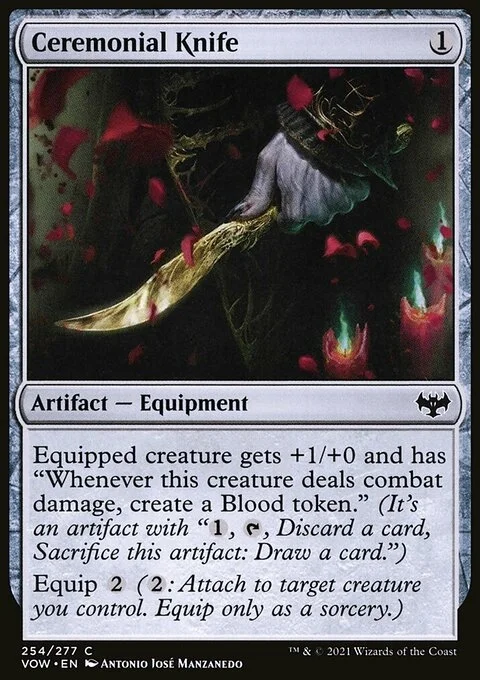 Equipped creature gets +1/+0 and has "Whenever this creature deals combat damage, create a Blood token." (It's an artifact with "{1}, {T}, Discard a card, Sacrifice this token: Draw a card.")
