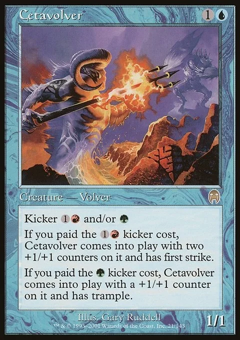 If Cetavolver was kicked with its {1}{R} kicker, it enters the battlefield with two +1/+1 counters on it and with first strike.