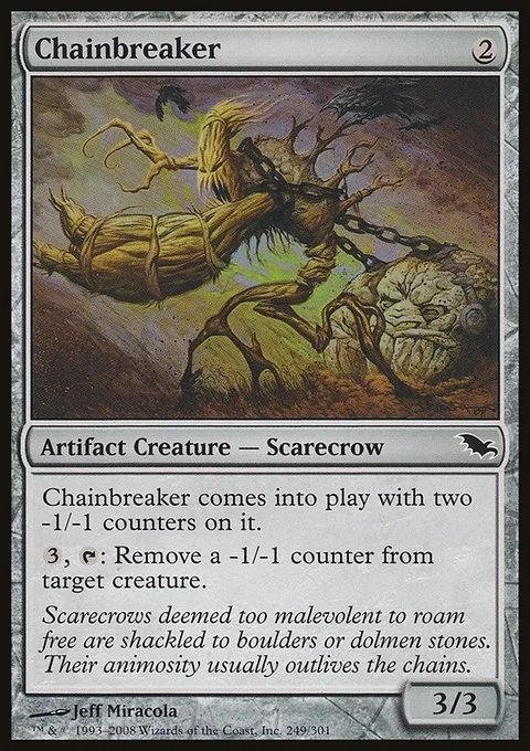 Chainbreaker enters with two -1/-1 counters on it. {3}, {T}: Remove a -1/-1 counter from target creature.
