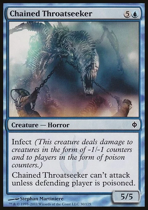 Infect (This creature deals damage to creatures in the form of -1/-1 counters and to players in the form of poison counters.) Chained Throatseeker can't attack unless defending player is poisoned.