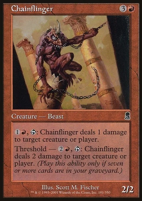 {1}{R}, {T}: Chainflinger deals 1 damage to any target. Threshold — {2}{R}, {T}: Chainflinger deals 2 damage to any target. Activate only if seven or more cards are in your graveyard.