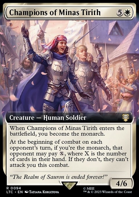 When this creature enters, you become the monarch. At the beginning of combat on each opponent's turn, if you're the monarch, that opponent may pay {X}, where X is the number of cards in their hand. If they don't, they can't attack you this combat.