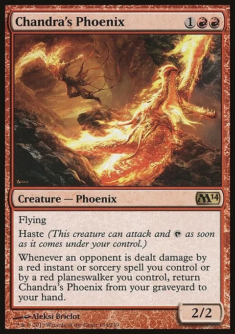 Flying Haste (This creature can attack and {T} as soon as it comes under your control.) Whenever an opponent is dealt damage by a red instant or sorcery spell you control or by a red planeswalker you control, return Chandra's Phoenix from your graveyard to your hand.