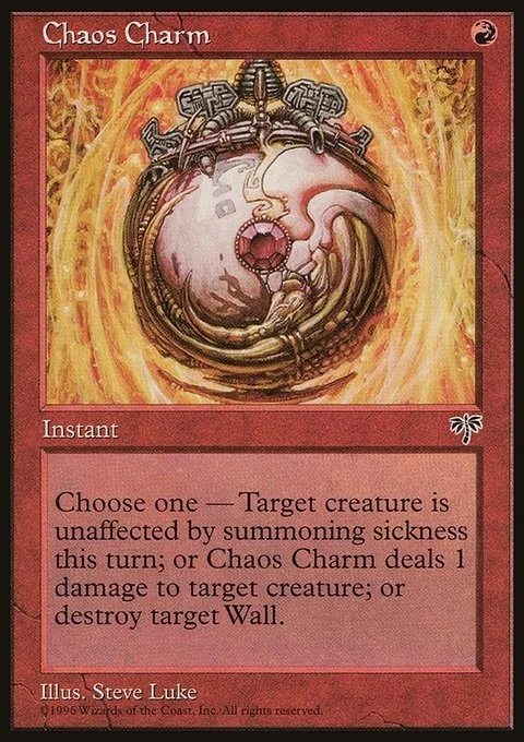Choose one — • Destroy target Wall. • Chaos Charm deals 1 damage to target creature. • Target creature gains haste until end of turn.
